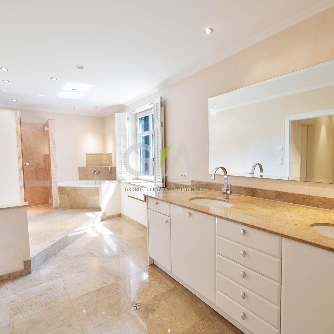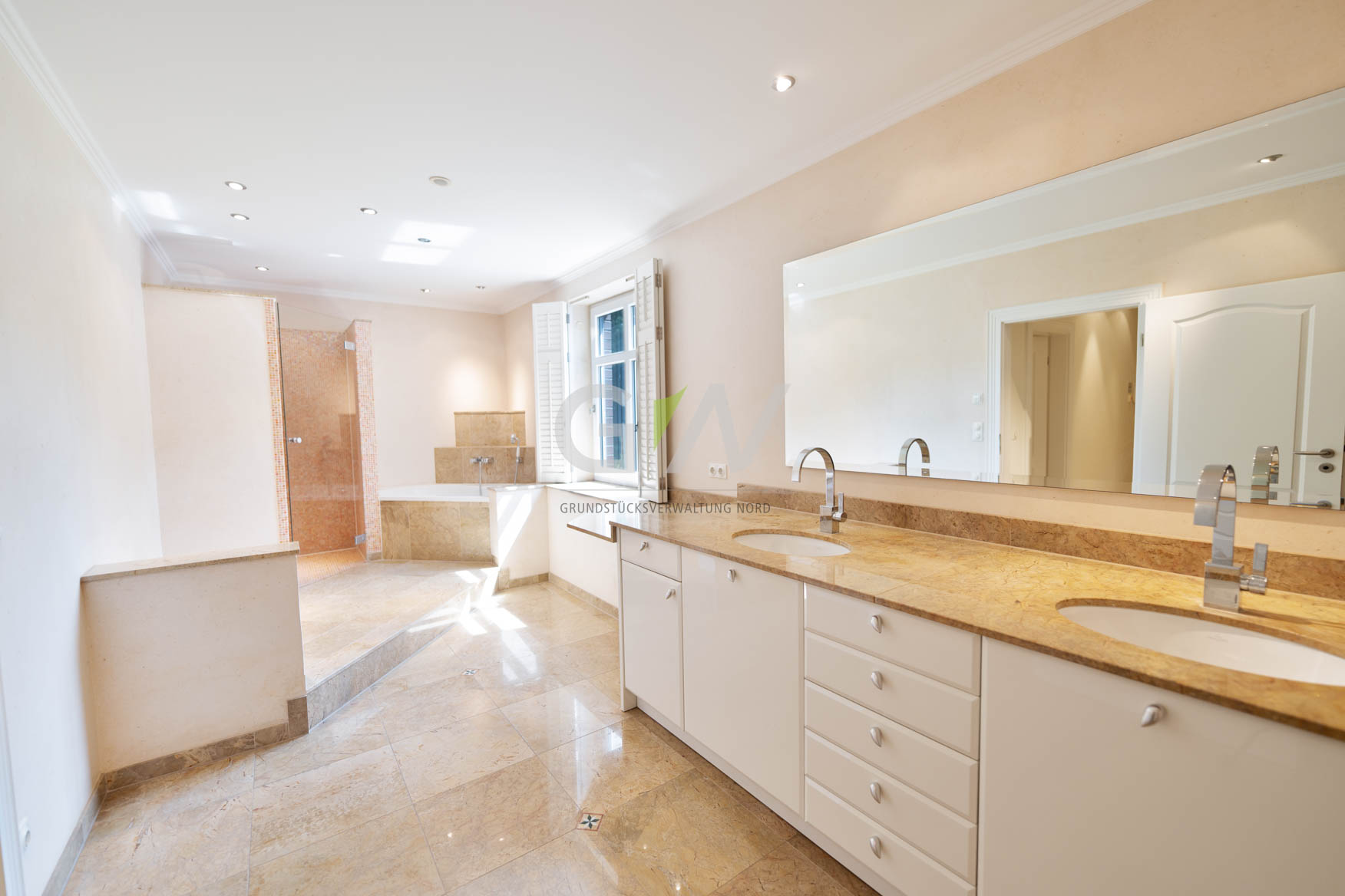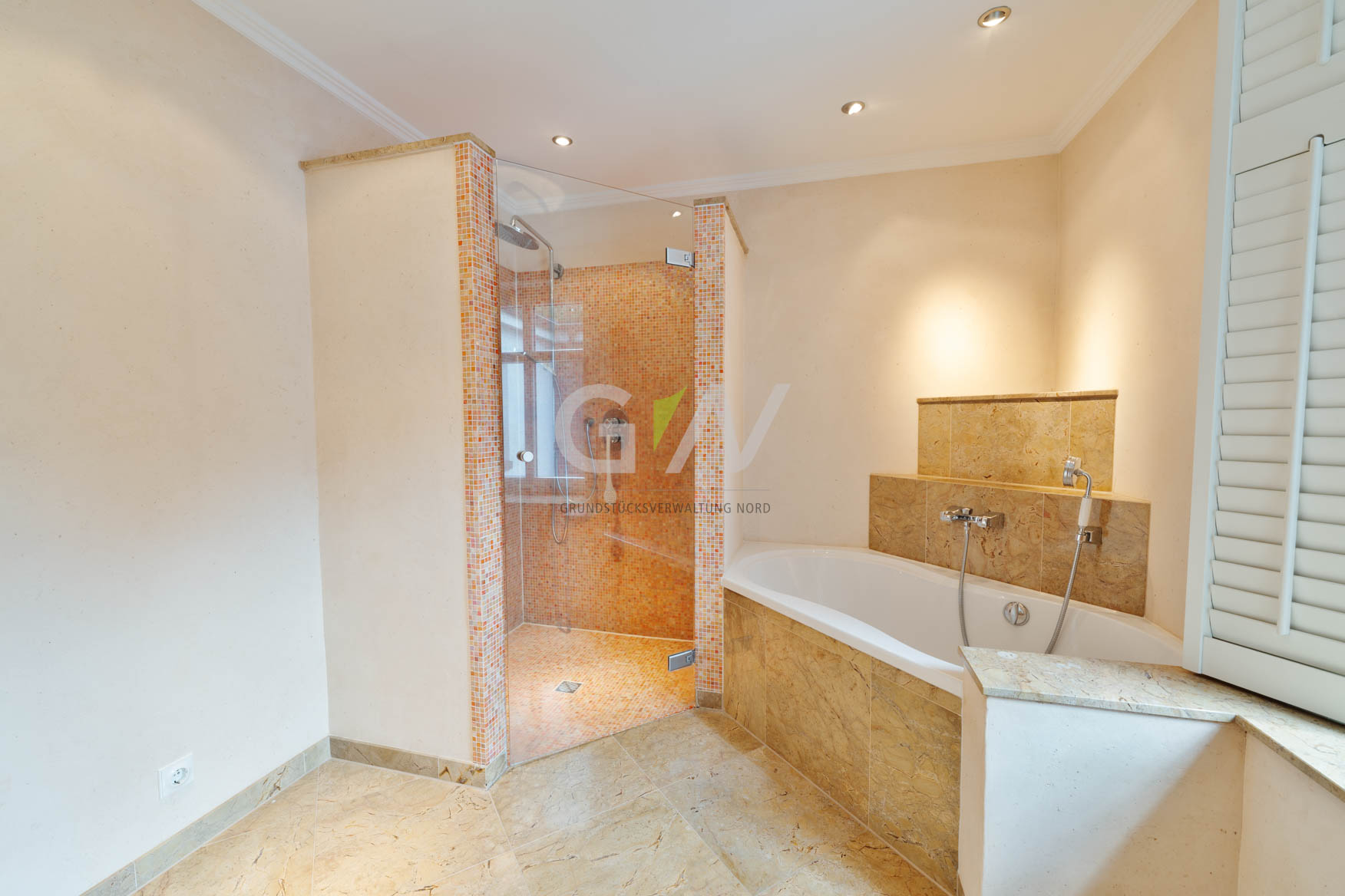 - Ein Masterbad mit Dusche & Wanne, Marmorfliesenbelag und Marmor-Doppelwaschtisch, separiertem WC und Bidet