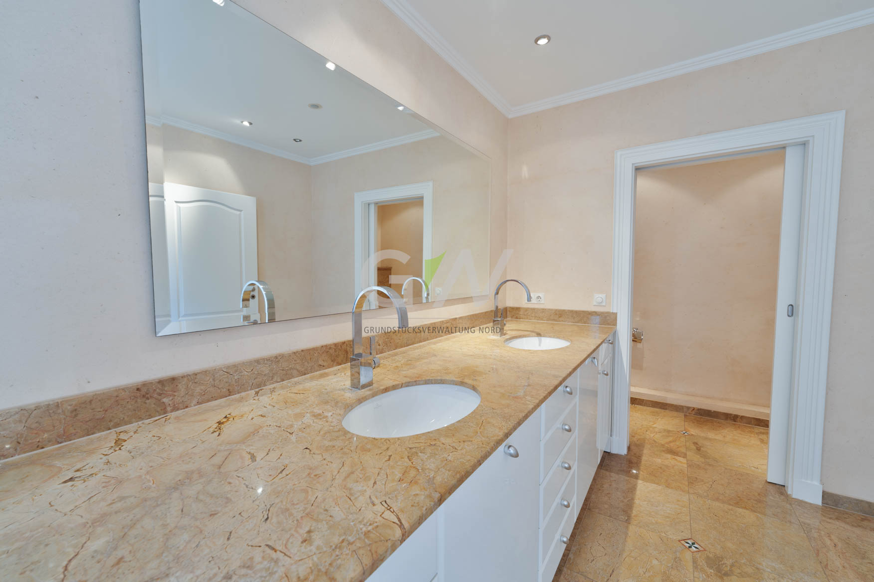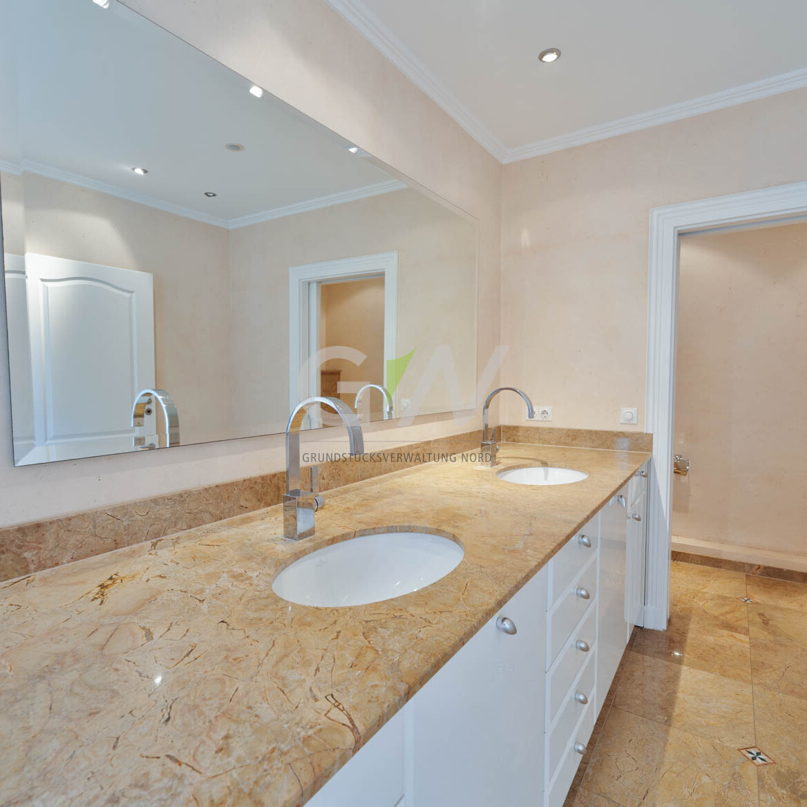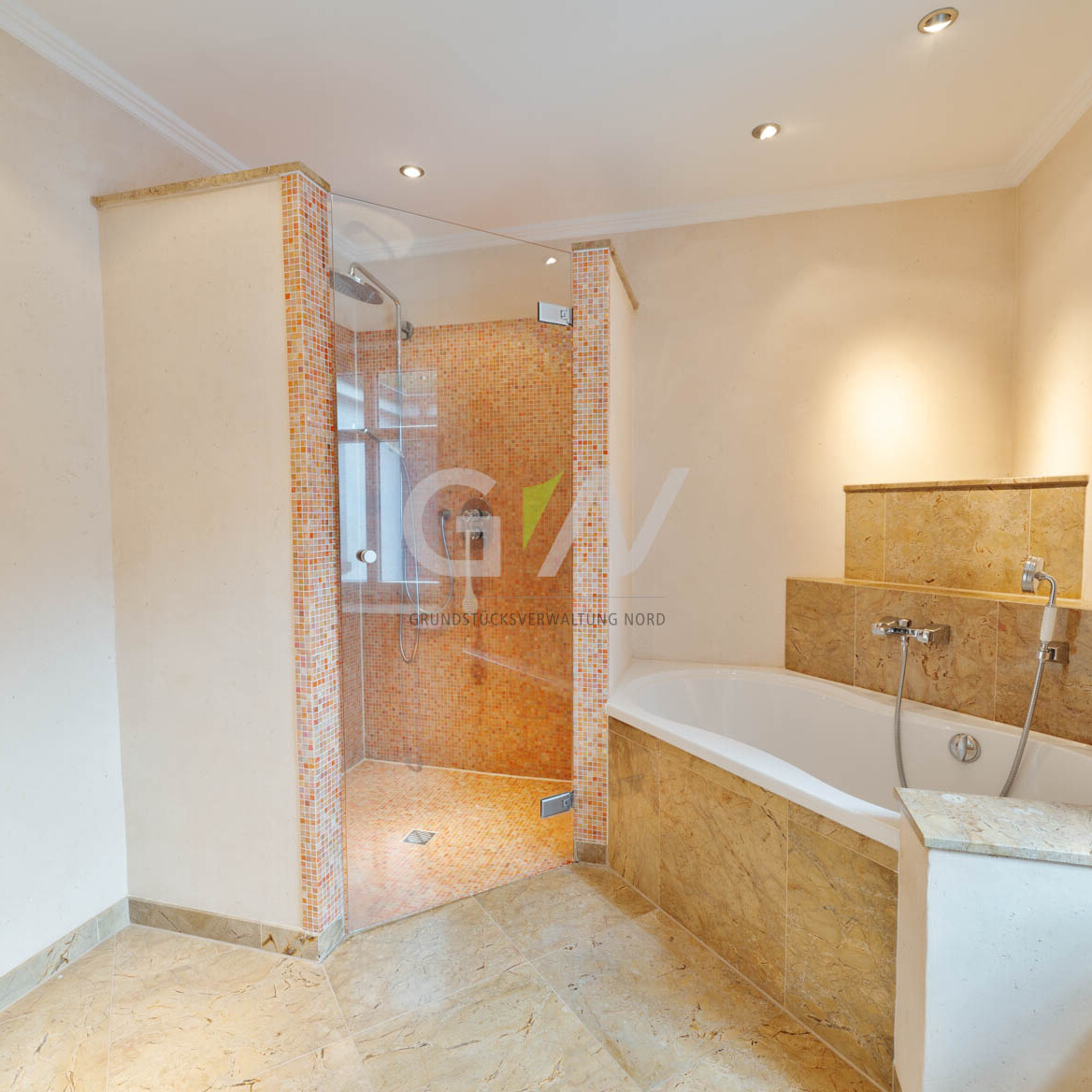 - Ein Masterbad mit Dusche & Wanne, Marmorfliesenbelag und Marmor-Doppelwaschtisch, separiertem WC und Bidet